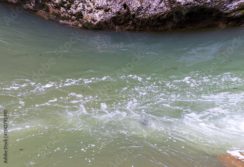 Fototapeta premium autumn morning on a mountain river with a deep canyon, the first changes in...