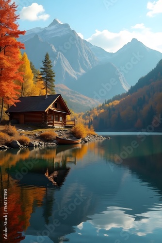 Fototapeta premium Autumn Mountain Reflections with Cozy Log Cabin and Boat by the Shore