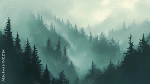 © Nikita, Obraz premium Autumn mountains shrouded in fog, with golden and red leaves on the trees, perfect for tranquil and reflective stock landscape photography.