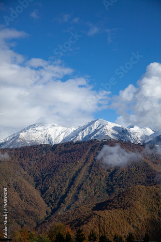 Fototapeta premium Autumn mountains with a snowy peak in blue sky