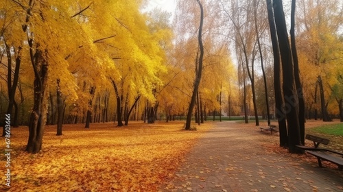 Fototapeta premium Autumn multi-colored trees in the city park zone. Fall forest. Romantic mood. Park alley with yellow leafes. Seasonal beautiful picture. Postcard concept.