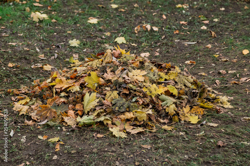 Fototapeta premium Autumn. Multicolored maple leaves lie on the grass