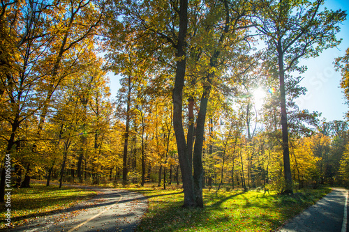 Fototapeta premium Autumn nature background. Path in the autumn park.