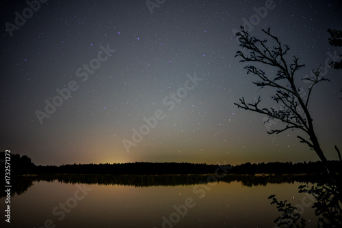 © Light&Lens, Naklejka premium Autumn Night Sky Reflected on Finnish Lake with Tree in Foreground