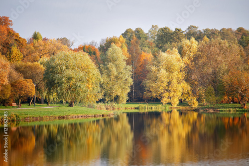 © NemanTraveler, Fototapeta premium Autumn October colorful park. Foliage trees alley
