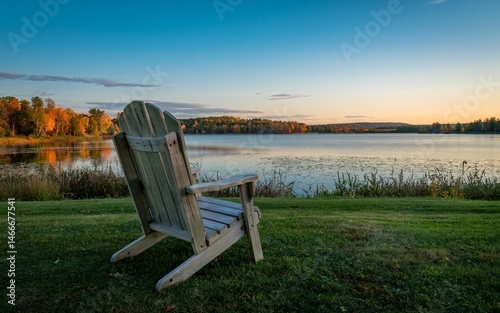 Fototapeta premium autumn Ontario, Canada, Empty Adirondack Chair Sunset Lakeside