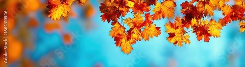© li, Fototapeta premium autumn orange maple leaves on a blue background with a bokeh effect. autumn nature banner, with space for text.