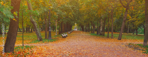 Fototapeta premium Autumn park alley road in city landscape. People walking on path in autumn...