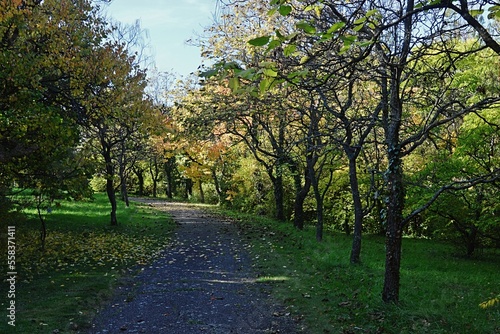 Naklejka premium Autumn park alley with yellowing broadleaf trees and nice spray of yellow...