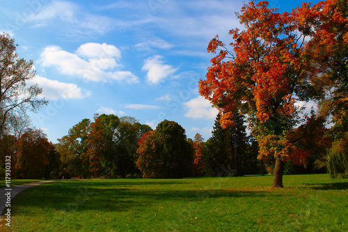 © salamandra1979, Naklejka premium Autumn Park. Autumnal Trees and Leaves in sun rays.