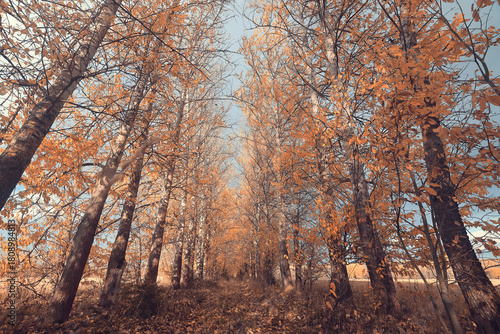 © kichigin19, Fototapeta premium Autumn park background landscape, trees in warm tones, nature photography