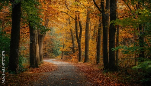 © GenZGraphics, Obraz premium Autumn park paths surrounded by trees, seasonal change
