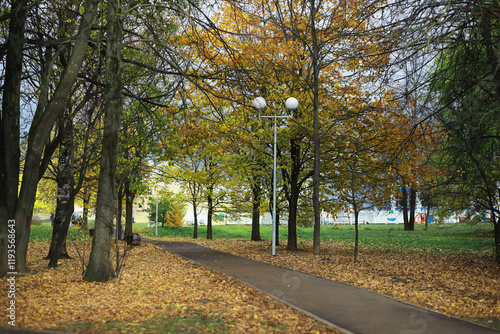 © alexkich, Fototapeta premium Autumn Park Pathway with Fallen Leaves and Colorful Trees on a Cloudy Day