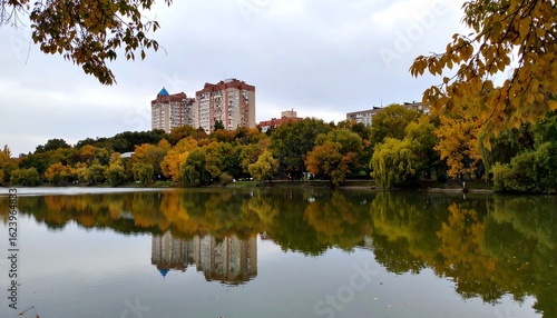 Fototapeta premium Autumn park reflecting buildings on a calm lake