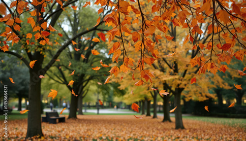 © Ornpitchayawee, Naklejka premium Autumn Park Scene with Falling Orange Leaves on Tree Branches, Vibrant Colors and Serene Atmosphere in Nature