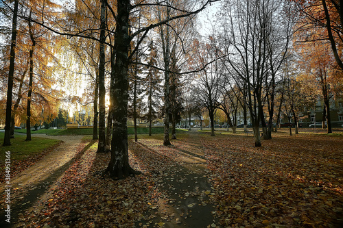 © kichigin19, Fototapeta premium autumn park sun landscape / seasonal autumn landscape in a yellow park, sun rays at sunset in October