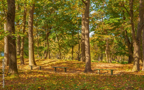 © allegro60, Fototapeta premium Autumn park with benches filled with yellow leaves