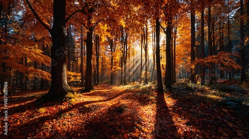 © Chayon Creative, Obraz premium Autumn park with tall trees in background of a blue sky a sunny environment