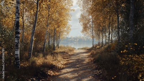 © rejeqy, Fototapeta premium Autumn path leading to a lake with trees showing fall colors and leaves on the ground