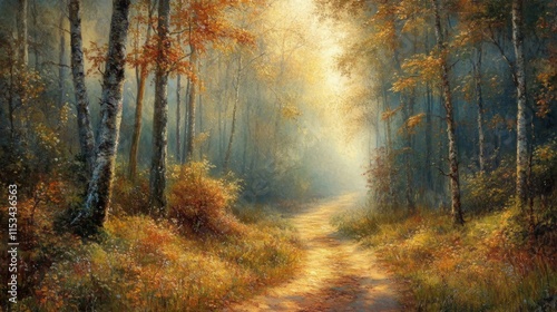 Obraz premium Autumn Path Through A Sunlit Birch Forest