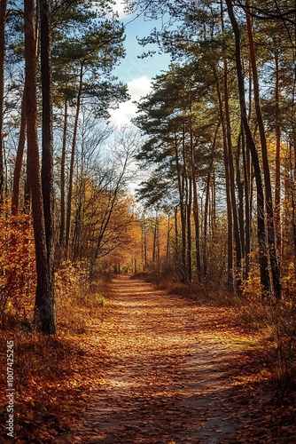 © atar, Fototapeta premium Autumn Path Through Sun Dappled Forest
