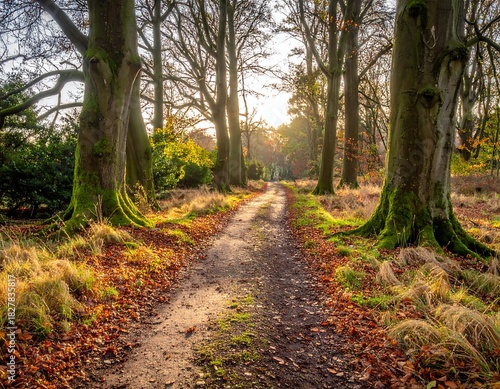 © Arii, Obraz premium Autumn path winding through a forest, leaves scattered, sunlight filtering through the trees, green moss covered trunks