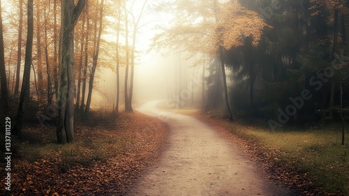 Fototapeta premium Autumn path winding through misty forest