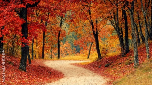 Naklejka premium Autumn path winding through vibrant forest, leaves covering ground