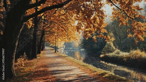 © AImmersive Imagery, Naklejka premium Autumn pathway lined with vibrant trees and reflections on a tranquil waterway creating a serene natural landscape scene