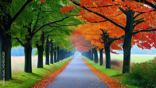 Naklejka premium Autumn pathway surrounded by vibrant colored trees
