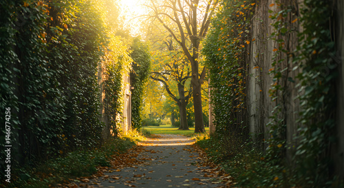 © 1St TH, Obraz premium Autumn Pathway Through Trees with Sunlight and Golden Leaves in a Scenic Park View