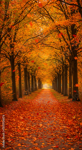 Naklejka premium Autumn pathway through vibrant orange trees