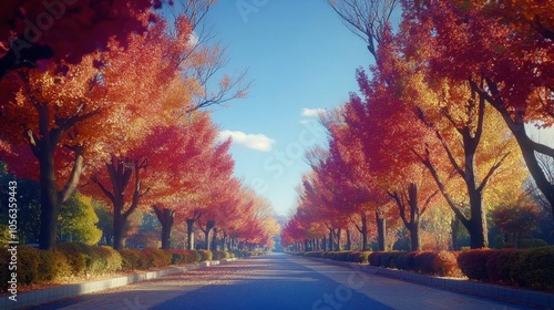 © Puttipong, Obraz premium Autumn Pathway Through Vibrant Red Trees