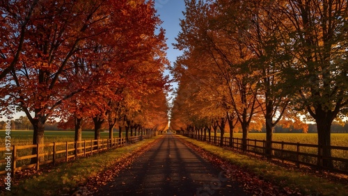 © Rahmatsapp, Naklejka premium Autumn Pathway with Vibrant Red and Orange Trees