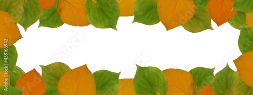 © Franco Tognarini, Obraz premium Autumn, persimmon leaves frame, green and orange fallen leaves. Border isolated on white background. Flat layout, top view, copy space, web banner
