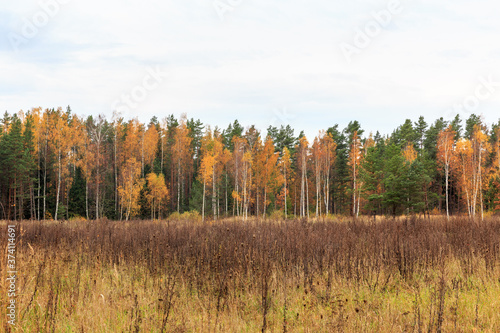 Fototapeta premium Autumn pine forest and yellow golden deciduous trees, panorama