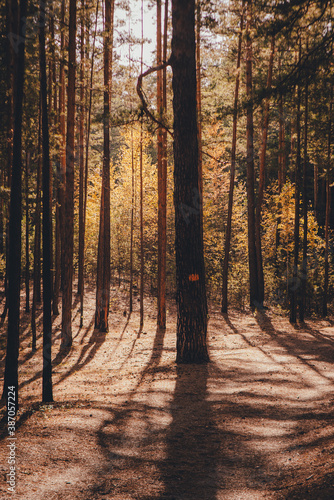 Obraz premium Autumn pine forest, large shadows from the trees.