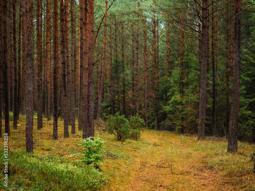 Obraz premium autumn pine tree deep forest, moody woods, fall season weather