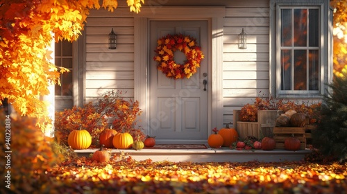 Obraz premium Autumn Porch with Pumpkins and Fall Wreath