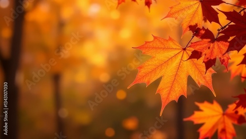 © Soul, Fototapeta premium Autumn postcard. Wooden table with orange leaves and blurred autumn background