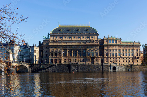 Naklejka premium Autumn Prague Old Town with National Theatre in the sunny Day, Czech Republic