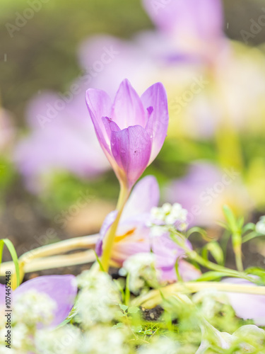 Fototapeta premium Autumn purple crocuses bloomed above the ground.