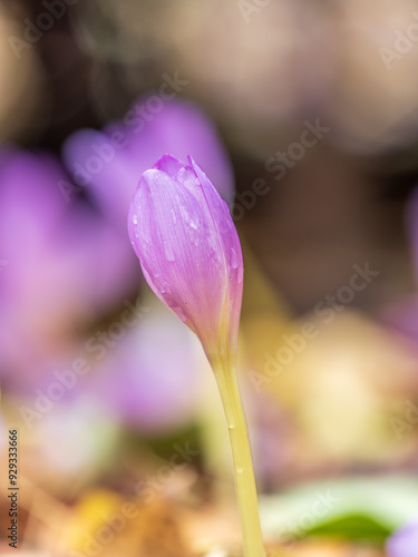 © Dmitrii Potashkin, Fototapeta premium Autumn purple crocuses bloomed above the ground.