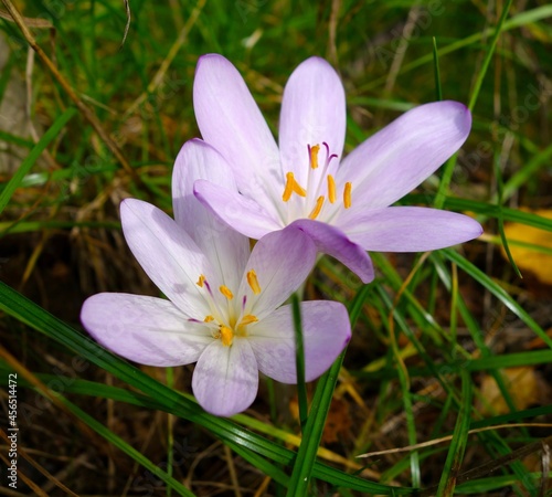 © Evgenija, Fototapeta premium autumn purple crocuses in the grass