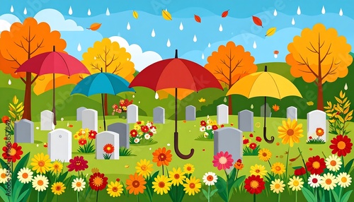 © Andri, Fototapeta premium Autumn Rain Cemetery Scene.
