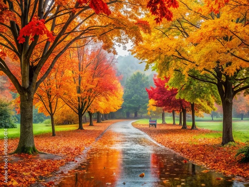 Naklejka premium Autumn Rain in the Park - Fall Colors, Wet Leaves, Tranquil Atmosphere, Nature Walk, Scenic Beauty, Colorful Trees, Reflection in Puddles, Cozy Vibes, Outdoor Serenity