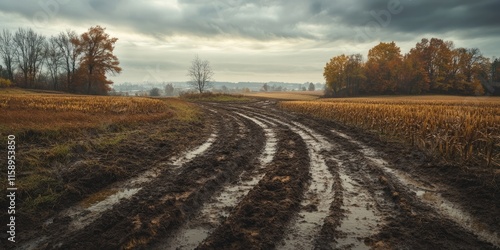 Naklejka premium Autumn rains have transformed the agricultural field, creating mud and ruts...
