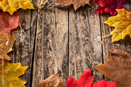 © chandlervid85, Obraz premium Autumn red and orange leaves background with copy space