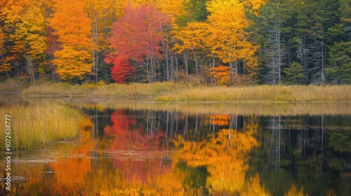 © amarta, Fototapeta premium Autumn Reflection in a Tranquil Lake