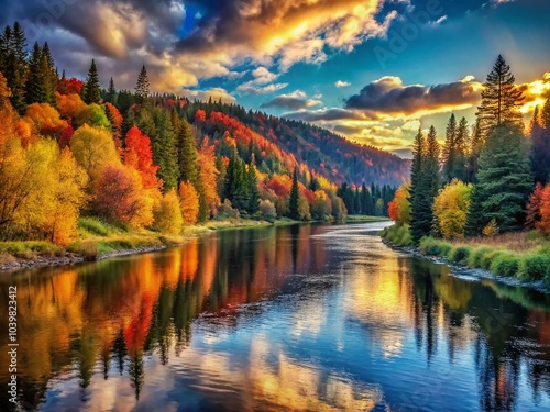 Naklejka premium Autumn River Landscape at Sunset with Colorful Forest and Spruce Trees Reflected in Calm Water